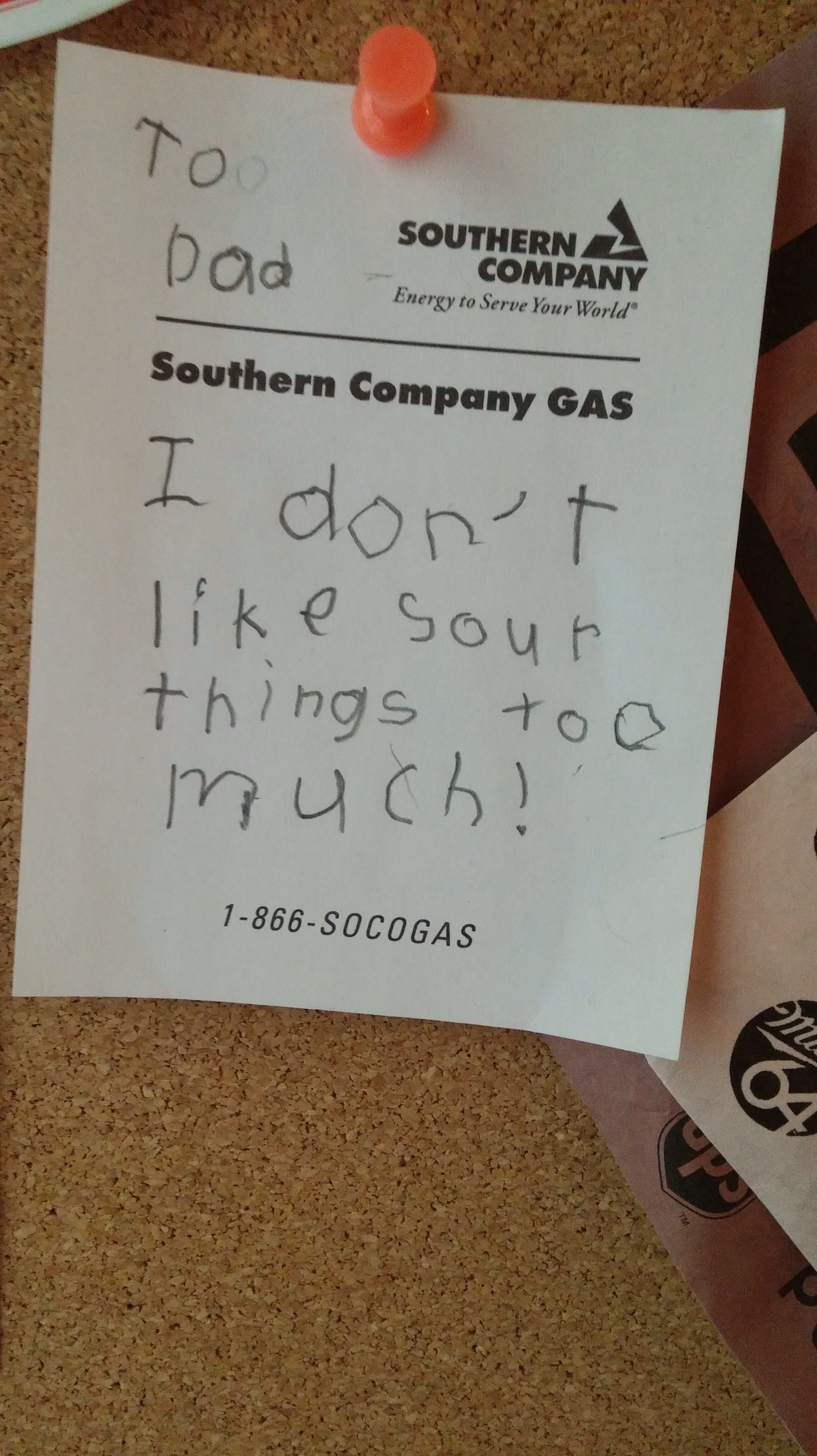 From Luke, after I left him some candy one day when he was about … who knows? Maybe 4. Or 5? Old enough to know to erase that first extra “o,” though. And add one later, it looks like.