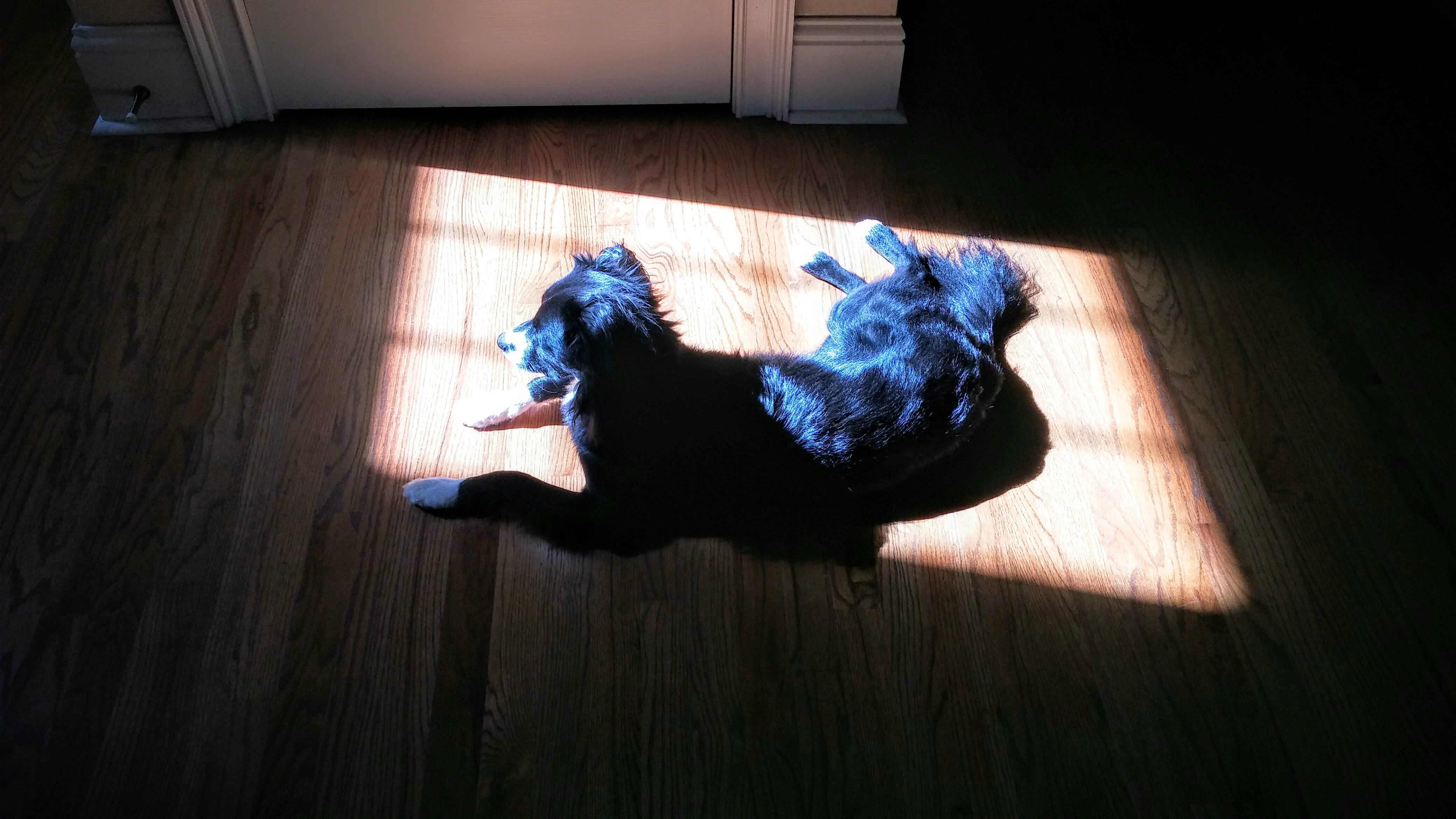 At night, he’s on the foot of the bed until I get there, then I slip my hands under him and move him to the couch. In the morning, you can hear him unfold onto the floor and pad his way over to Mary Jo’s side of the bed, where he’ll nuzzle her hand until she gets up.