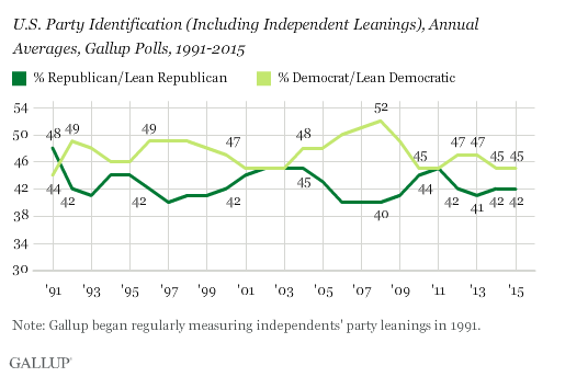 Only 26 percent of people polled by Gallup call themselves Republicans. Only 29 percent say they’re Democrats. And a whopping 42 percent call themselves independent.