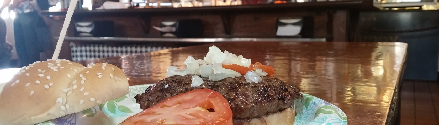 And, thank God, the best burger I ever had — at least that’s how I remember it — is still being broiled over an open flame at The Chuckbox, a lovably dingy dive just a block or two west of the bridge on University. Had a Great Big One (top of page) on that Monday that I was in town. Damn good. The place looks exactly as I remember it.