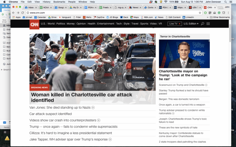 The statement, of course, set jaws dropping. A neo-Nazi, white supremacist, hate-filled group, complete with vile chants and torch-carrying white men (and, I guess, women), descended upon a mostly liberal town looking for a fight, got into street skirmishes, one of their sympathizers (members?) ran over a counter-protester, and Trump is blaming both sides? Both the hate group and those standing up to the hate?