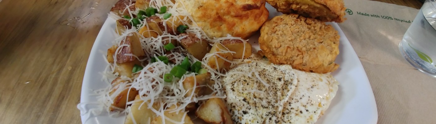 And there’s my baby (^^^), including (counterclockwise from 9 o’clock): some pungently perfect cheese on a heap of fried potatoes, two nicely done but admittedly over-peppered (that’s on me) over-easy eggs, a generously cut trio of slightly tangy, faintly spicy fried green tomatoes (oh … man) and the biscuit.