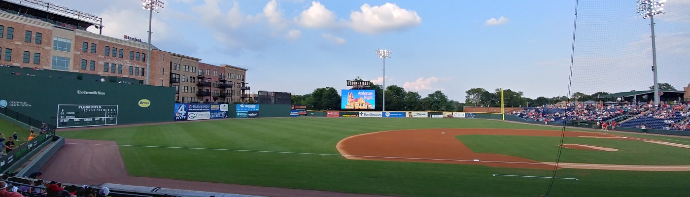 After a leisurely day driving up from Atlanta, checking in and then wandering Greenville’s downtown area, we walked from our hotel to the park — maybe 10 blocks — stepped up to the window and paid $10 a ticket for a seat that, in a big-league park, would probably set you back $50 apiece. At least.