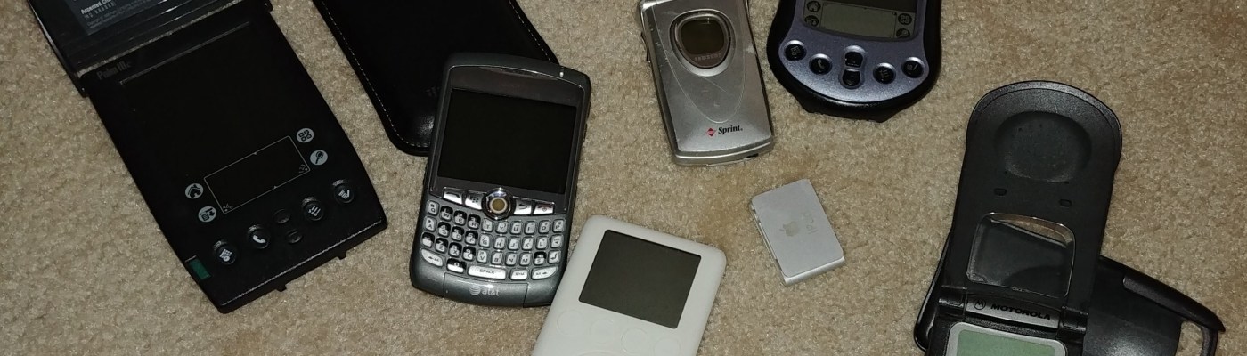 (I kept, because I thought Luke might like to see and tinker with some old-school tech ^, an old Motorola flip phone complete with belt holster, a cool Samsung flippy that I loved, a couple old iPod Shuffles, one of those white brick iPods, a Blackberry — look at that thing! — and two Palm Pilots.)