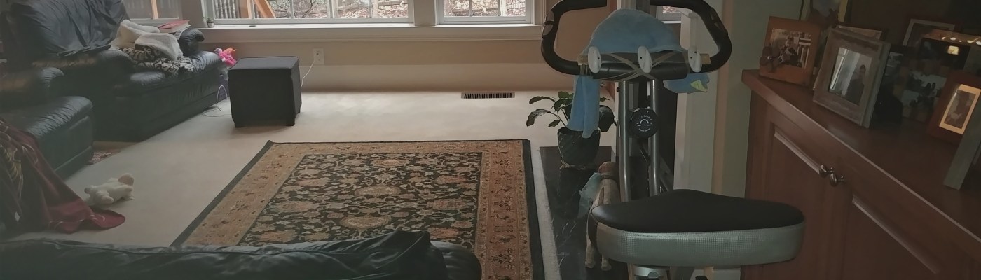 After breakfast, I mount a cheapie stationary bike parked next to a love seat in our living room (^) and I pedal. I pedal until the sweat is dripping and my patience runs out. I pedal while I think about this world, and the virus, and our finances, and my family, and what’s next once (if?) all this virus stuff passes. I pedal some more.