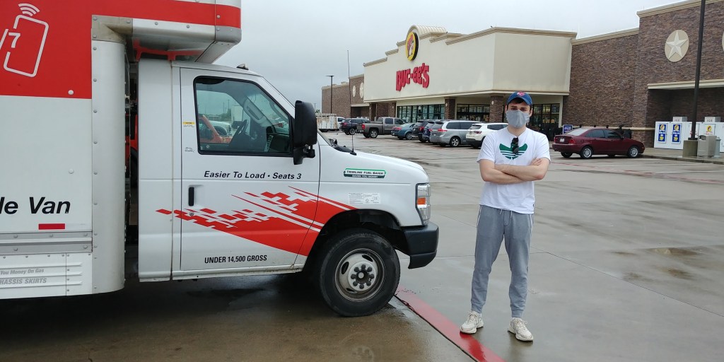 The highlight of the day — other than the tiptoeing talk about Luke’s future, his plans with his girlfriend, his new job, his new roommates, his new room in his new house, and the endless to-do list he needed to attack once we arrived — was a lunch stop at a Whataburger in Sweetwater, a few miles past Abilene. We parked the rig, walked in to get our burgers, walked back to the rig, rolled up the back door of the truck, and ate on two beach chairs in the cargo area. You know; pandemic and all.