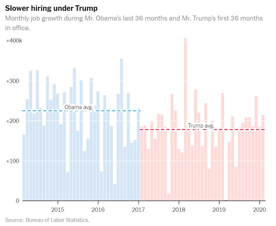 Opponents counter that only about half of Americans have a 401k, and most are held by people with much more money than the average American. They say his trade war with China has been disastrous, and his fealty to big business shameful. They worry about continuing economic inequality, about his lack of a health care plan, and about his mission to pull health care from millions of needy families — during a pandemic — by crushing what’s left of the law passed a decade ago. They show that Trump’s job growth isn’t as great as it was under his predecessor.