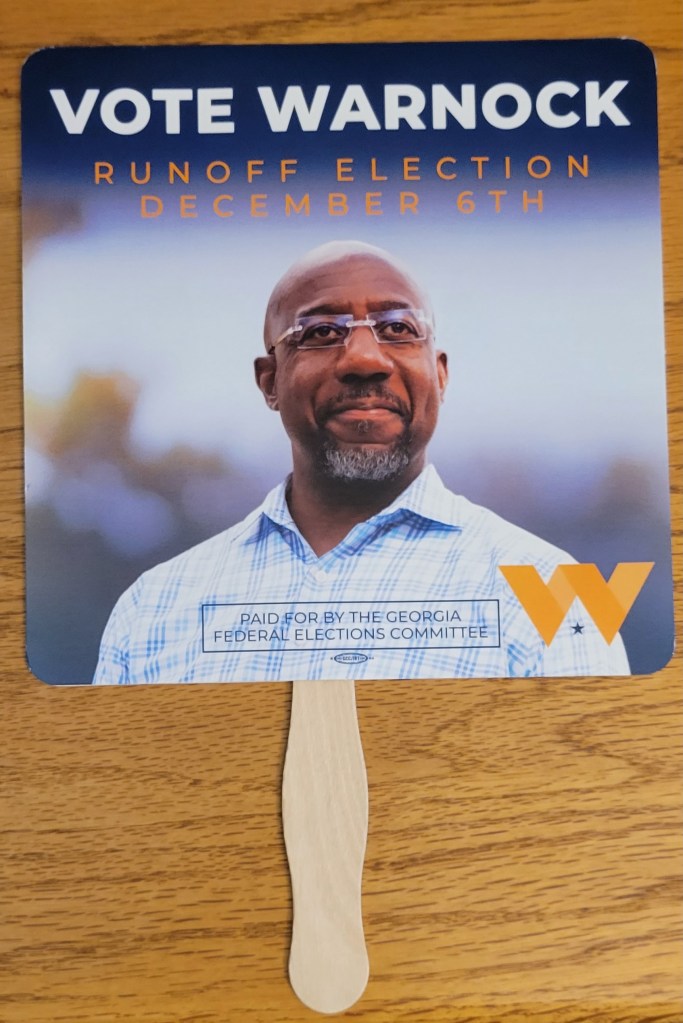 The blue circle on the doorbell came to whirring life, the first sign that there’d be a lot of stoop-standing in this door-to-dooring and a lot less face-to-facing than I imagined. My political partner and I, Mindy from Seattle, were in a neighborhood in Lilburn, about 20 miles or so from my house and 25 miles or so northeast of downtown Atlanta. We were equipped with a list of dozens of houses to hit up, a bunch of cardboard fans with the Reverend’s face on them, big postcards stating our intentions, and a couple pads of stickers that included a QR code that provided information on where to vote. The idea, ideally, was to get facetime with potential voters, but if no one was home — or, equally as likely, if no one answered the door — we were to tuck the flier into the door jamb and slap the sticker somewhere the homeowners could see it. In a gut punch to writers and college professors everywhere, this was called a “lit drop.”